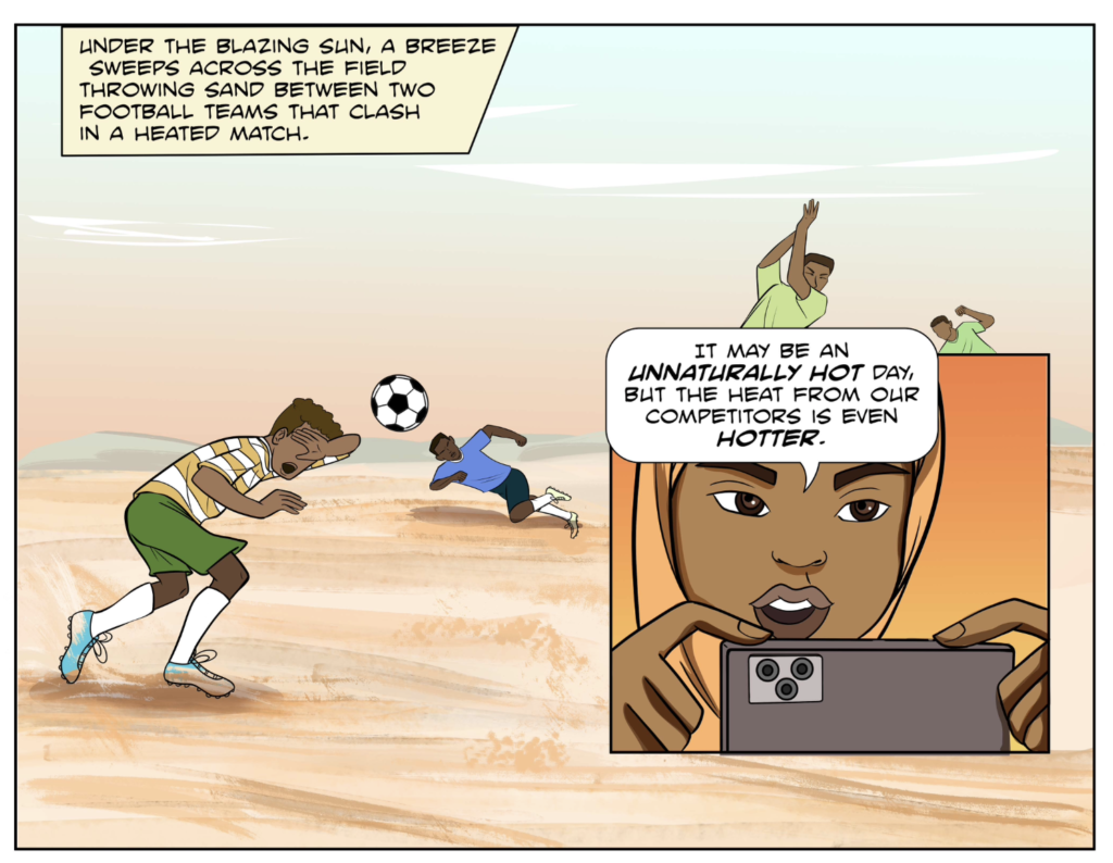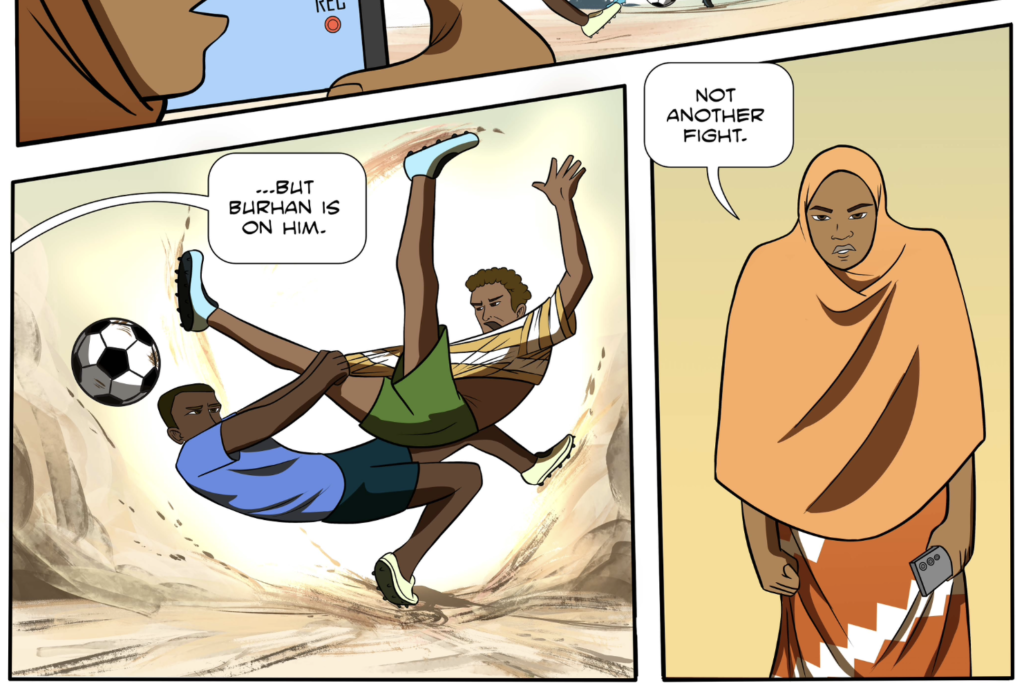 What begins as a high-stakes football match (Pages 3–8) quickly devolves into a physical altercation. Their rivalry mirrors a growing social divide in the region. Liban leads a team from an IDP (Internally Displaced Persons) camp; people forced from their ancestral homes by environmental collapse. Burhan, representing the settled town community, views these newcomers with a mixture of arrogance and hostility, dismissing them as “homeless nobodies”.