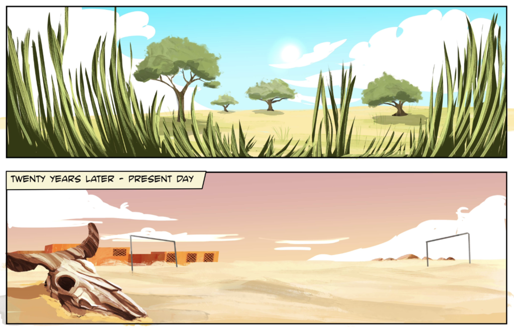 The transition from this lush imagery to the sight of a bleached cattle skull resting in the sand is a stark visual representation of “climate change”. As the characters reflect on what has been lost, the comic makes it clear that the sand “took over all the land,” forcing families to flee and leading to the very displacement that created the friction between Liban and Burhan.