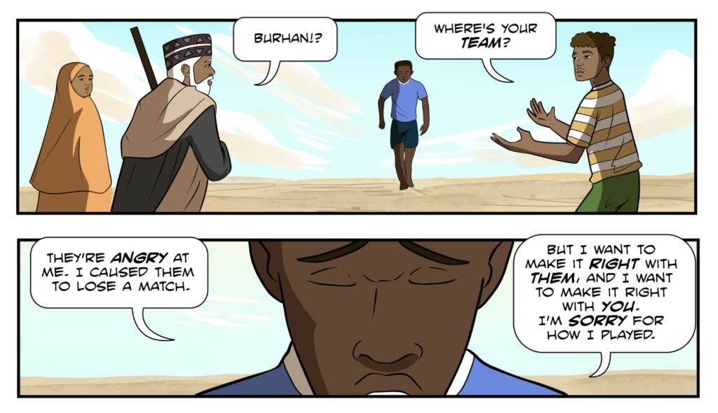 Additionally, Burhan’s redemption arc feels slightly rushed. His transformation from a hostile captain to a cooperative peacebuilder occurs almost instantaneously between the match and the restoration efforts. The absence of sustained ideological resistance within Burhan’s arc simplifies what is, in reality, a deeply complex social tension. Conflict is introduced with weight but resolved with efficiency, suggesting a preference for cohesion over confrontation. The inclusion of a silent “beat”, a panel dedicated to internal reflection or a moment of shared eye contact would have made this pivotal character shift feel more earned.