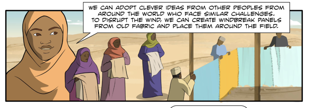The community begins to implement “clever ideas” adapted from global successes. They plant “indigenous trees” and protect them with “soil bunds”, earthen barriers designed to capture precious rainwater. They pair this with grass planting to bind the soil and prevent further erosion. Furthermore, they create “windbreak panels” from old fabric to shield the saplings from the desiccating power of the desert winds.